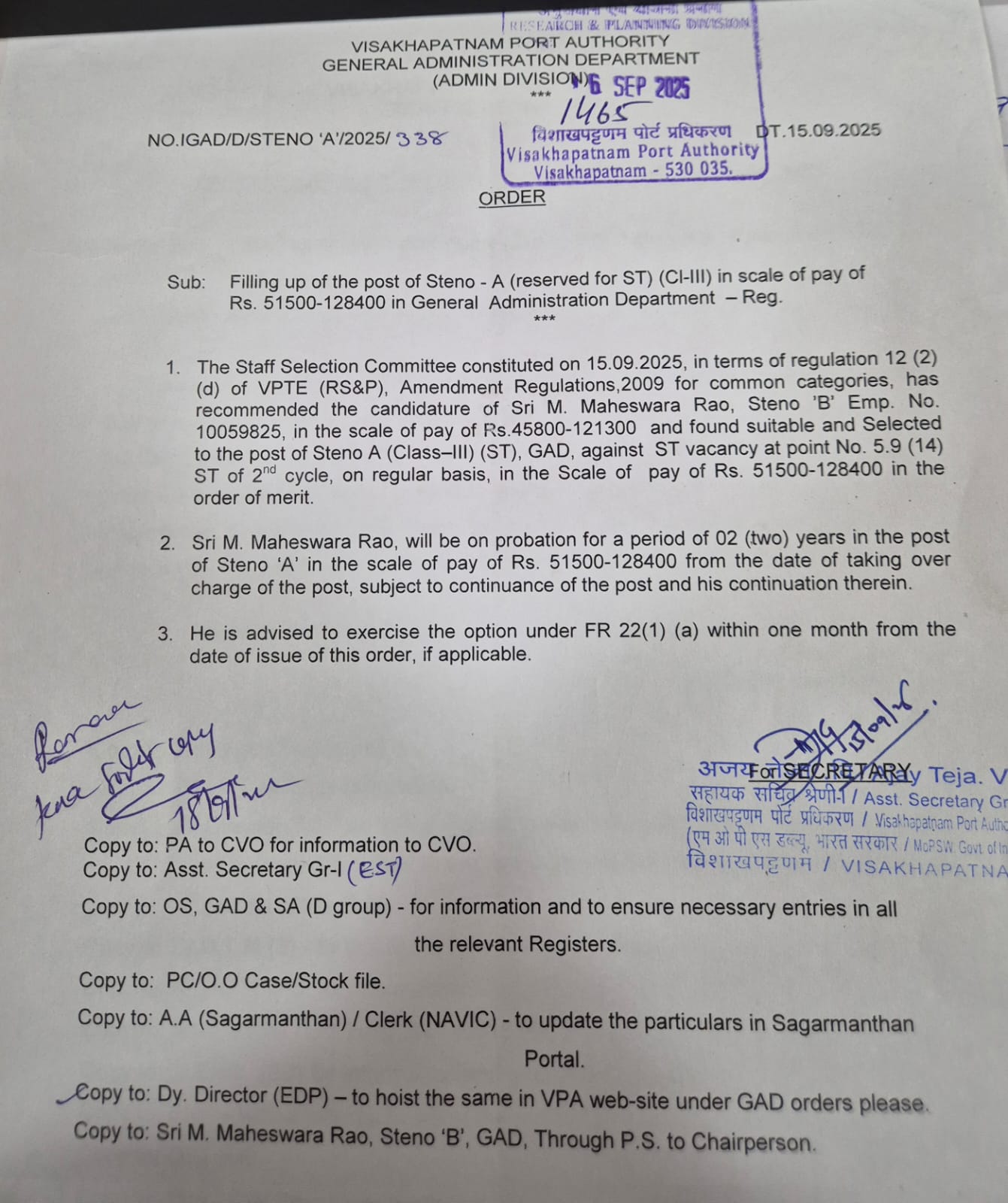 757 | NO. IGD/D/STENO'A'/2025/338 DT. 15-09-2025 | Office orders | Filling up of the post of Steno-A (reserved for ST) Cl-III in scale of pay of Rs. 51500-128400/- in GAD | Administration | 15-09-2025 | Document |