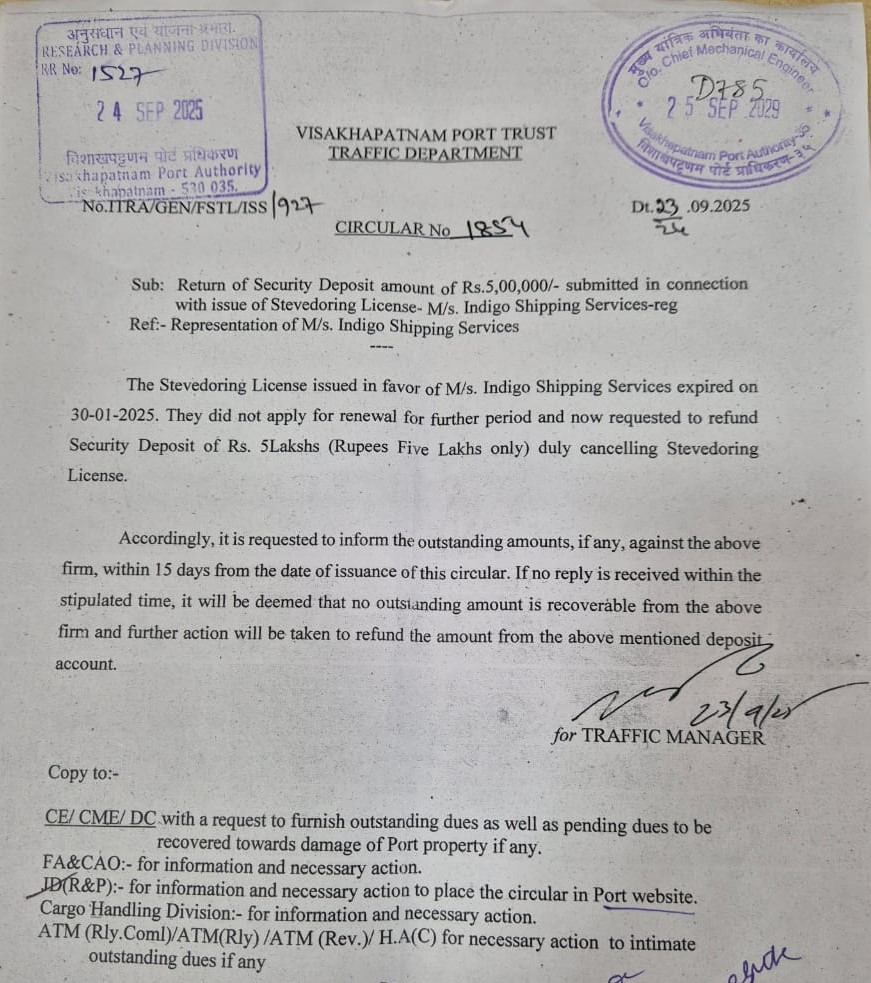 762 | 1854 | General | Return of Security Deposit amount of Rs. 5,00,000/- submitted in acconection with issue of Stevedoring License-M/s. Indigo shipping Servicess | Traffic | 24-09-2025 | Document |