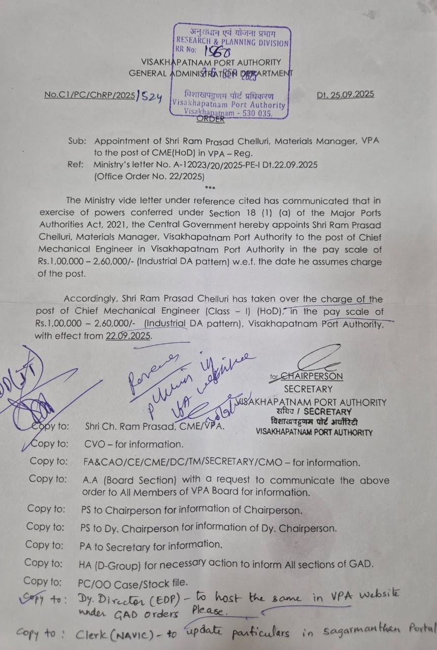763 | C1/PC/ChRP/2025/524 DT. 25-09-2025 | Office orders | Appointment of Shri Ram Prasad Chelluri, Materials Manager-VPA | Administration | 25-09-2025 | Document |