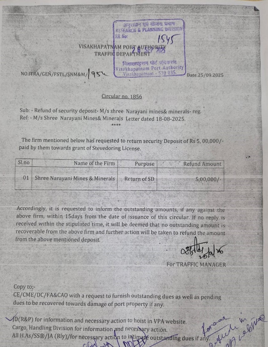 764 | 1856 | General | Refund of Security Deposit - M/s. Shree Narayani mines & minerals | Traffic | 25-09-2025 | Document |