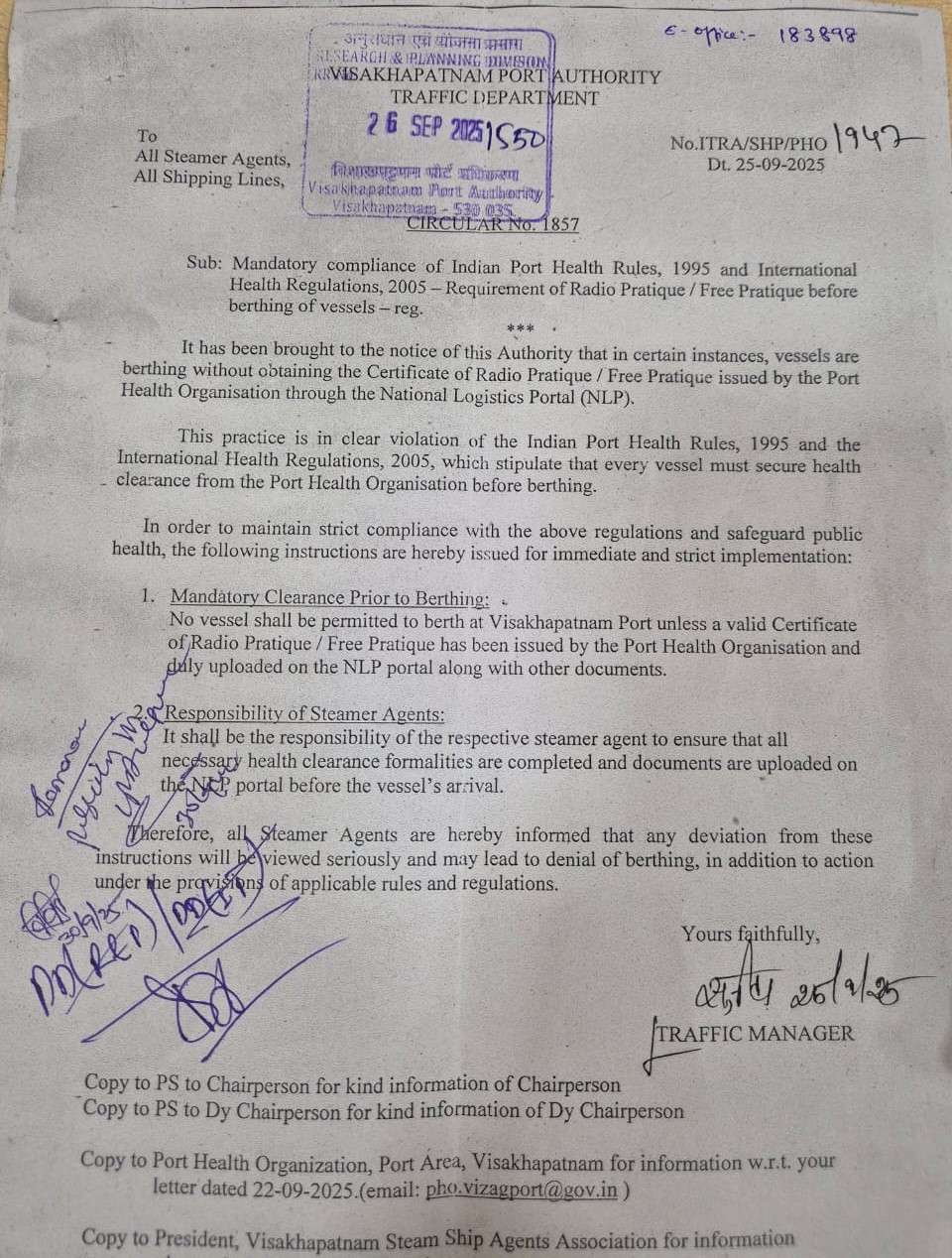 765 | 1857 | Shipping | Mandatory compliance of Indian Port Health Rules, 1995 and International Health Regulations 2005 - Requrement of Radion Pratique / Free Pratique before berhting of vessels | Traffic | 25-09-2025 | Document |