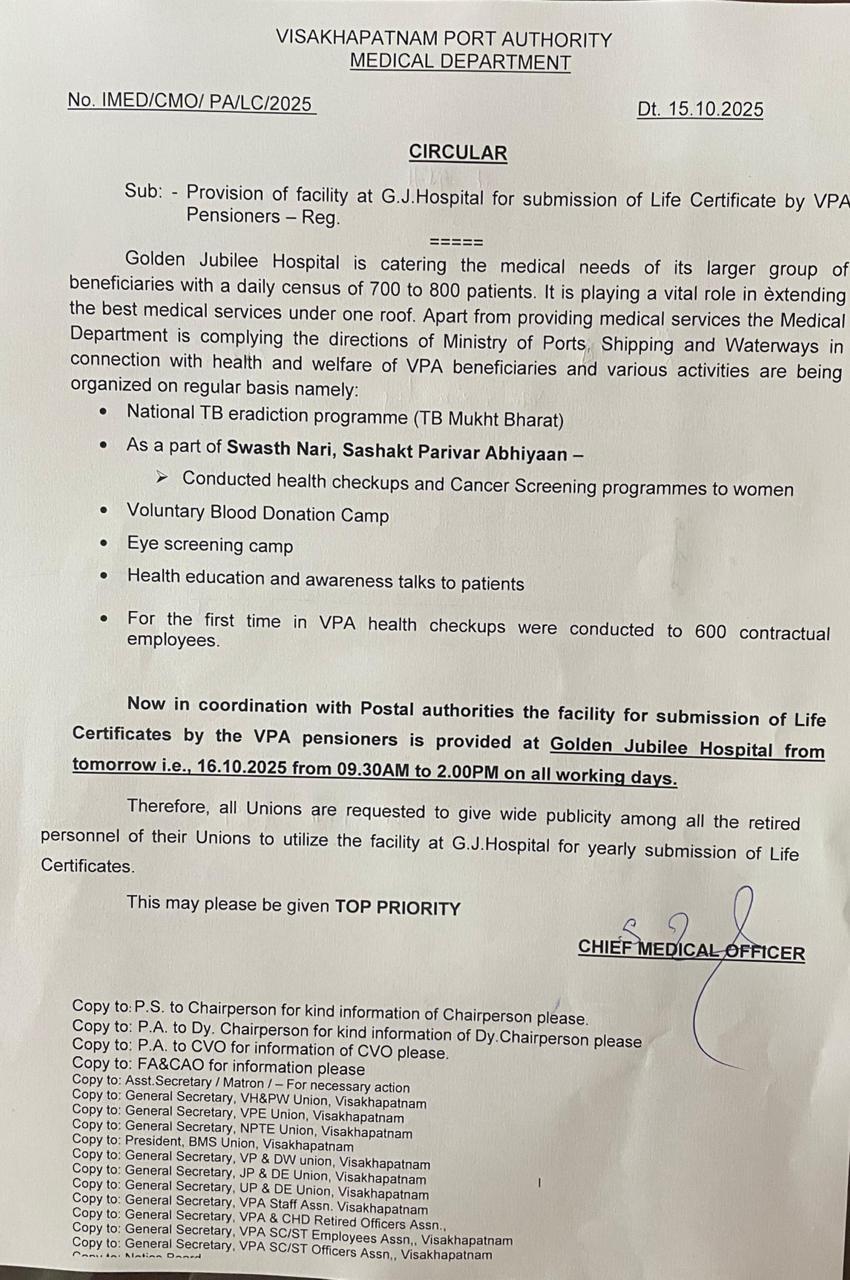 775 | IMED/CMO/PA/LC/2025 Dt: 15-10-2025 | General | Provisioin of facility at G.J. Hospital for submission of Life Certificate by VPA Pernsioners. | MEDICAL | 15-10-2025 | Document |